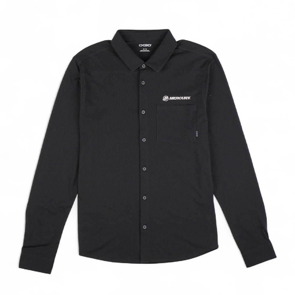 The Mercury Marine OGIO Button Down in black combines comfort with a sharp, modern look. Crafted from a lightweight poly-cotton knit, it offers stretch and a smooth finish with a subtle heather effect. Details include Mercury logo embroidered above the left chest pocket, tonal buttons, and signature OGIO accents for a refined touch. Designed with a slightly curved shirttail hem, it can be worn tucked or untucked for versatile styling.